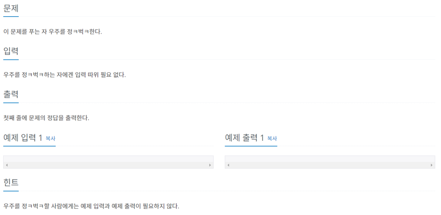 우주를 정ㅋ벅ㅋ할 사람에게는 예제 입력과 예제 출력이 필요하지 않다.