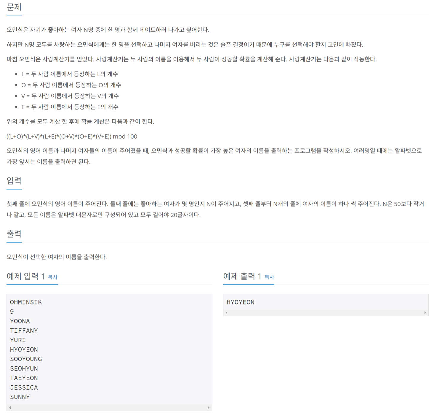 여자들의 이름을 w_list 에 넣어 정렬 후 민식이의 이름과 각 여자의 이름을 받아 count 함수를 사용해 찾고자 하는 문자열의 수가 몇 개인지 센 후 더했다. 그 후 사랑 계산기를 통해 사랑의 확률 p 를 계산한 후 조건문으로 사랑의 확률이 max_p 보다 클 경우 max_i 를 해당 이름으로 바꿔주었다. 마지막에 w_list[max_i] 를 출력한다.