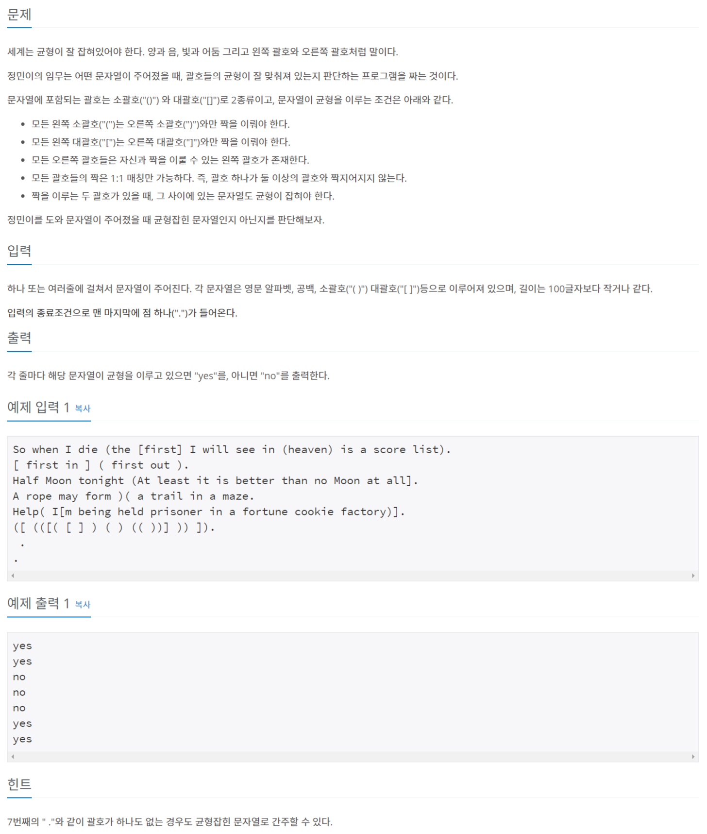하나 또는 여러줄에 걸쳐서 문자열이 주어진다. 각 문자열은 영문 알파벳, 공백, 소괄호("( )") 대괄호("[ ]")등으로 이루어져 있으며, 길이는 100글자보다 작거나 같다. 입력의 종료조건으로 맨 마