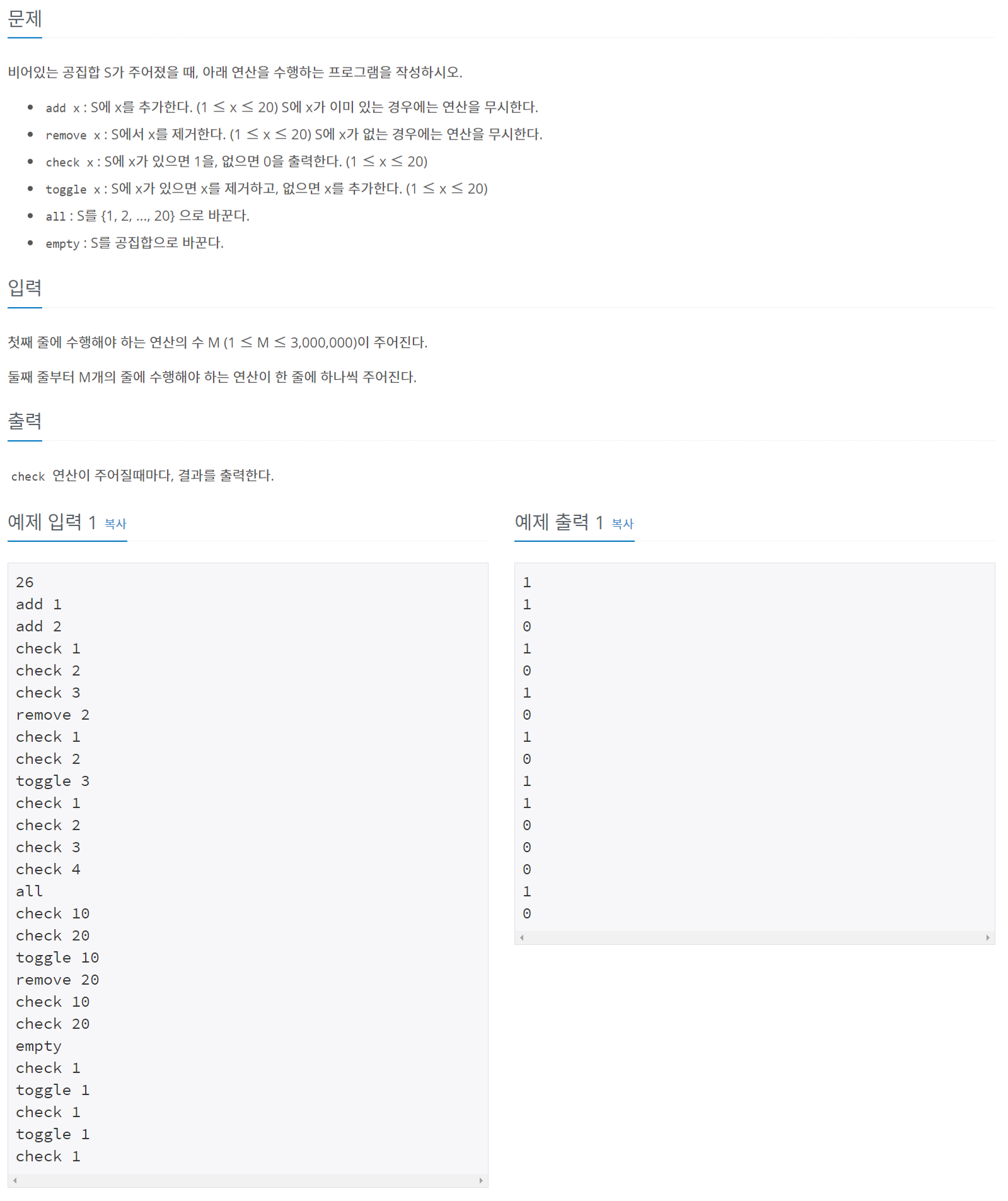 첫째 줄에 수행해야 하는 연산의 수 M (1 ≤ M ≤ 3,000,000)이 주어진다. 둘째 줄부터 M개의 줄에 수행해야 하는 연산이 한 줄에 하나씩 주어진다.