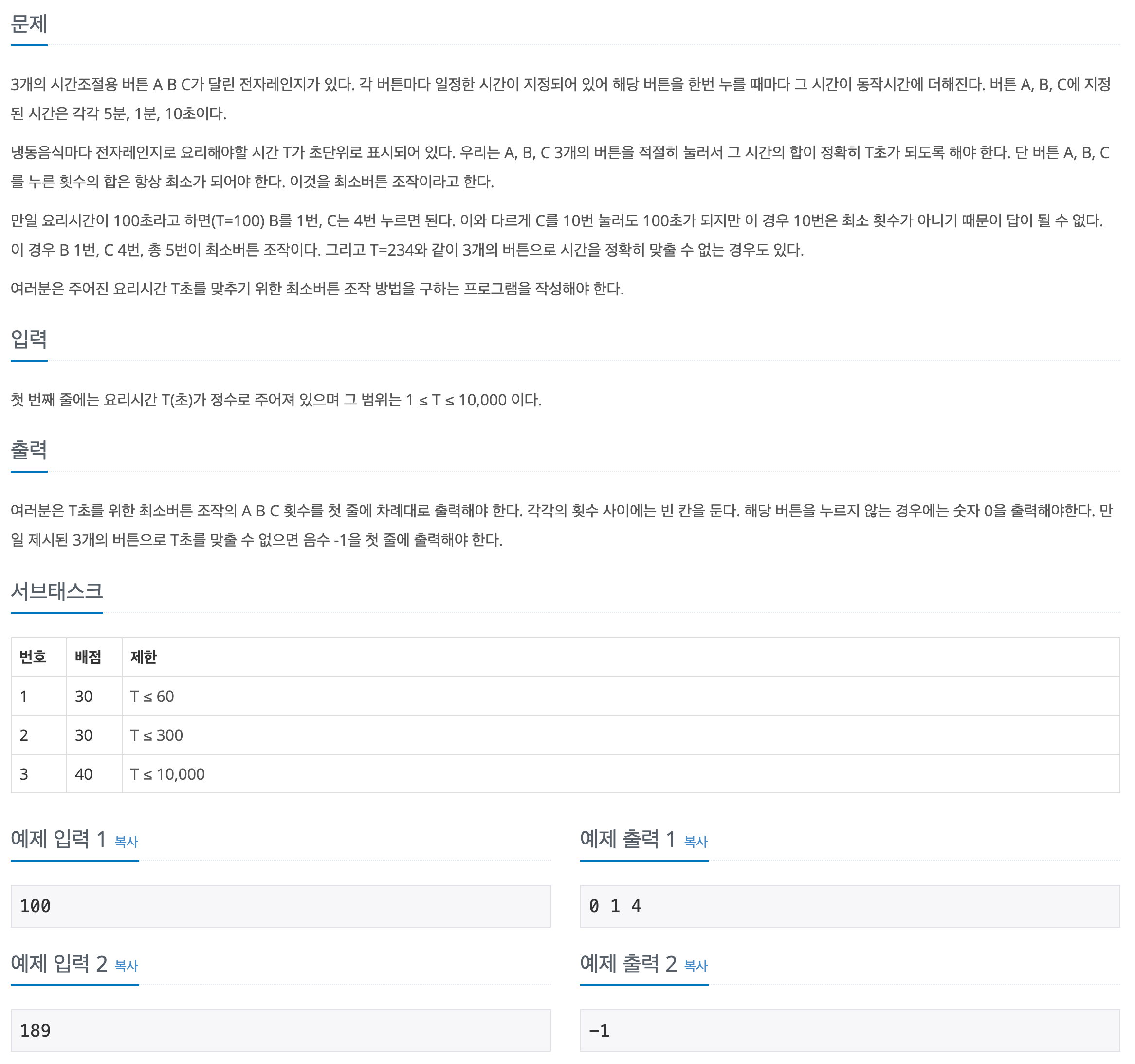 3개의 시간조절용 버튼 A B C가 달린 전자레인지가 있다. 각 버튼마다 일정한 시간이 지정되어 있어 해당 버튼을 한번 누를 때마다 그 시간이 동작시간에 더해진다. 버튼 A, B, C에 지정된 시간은