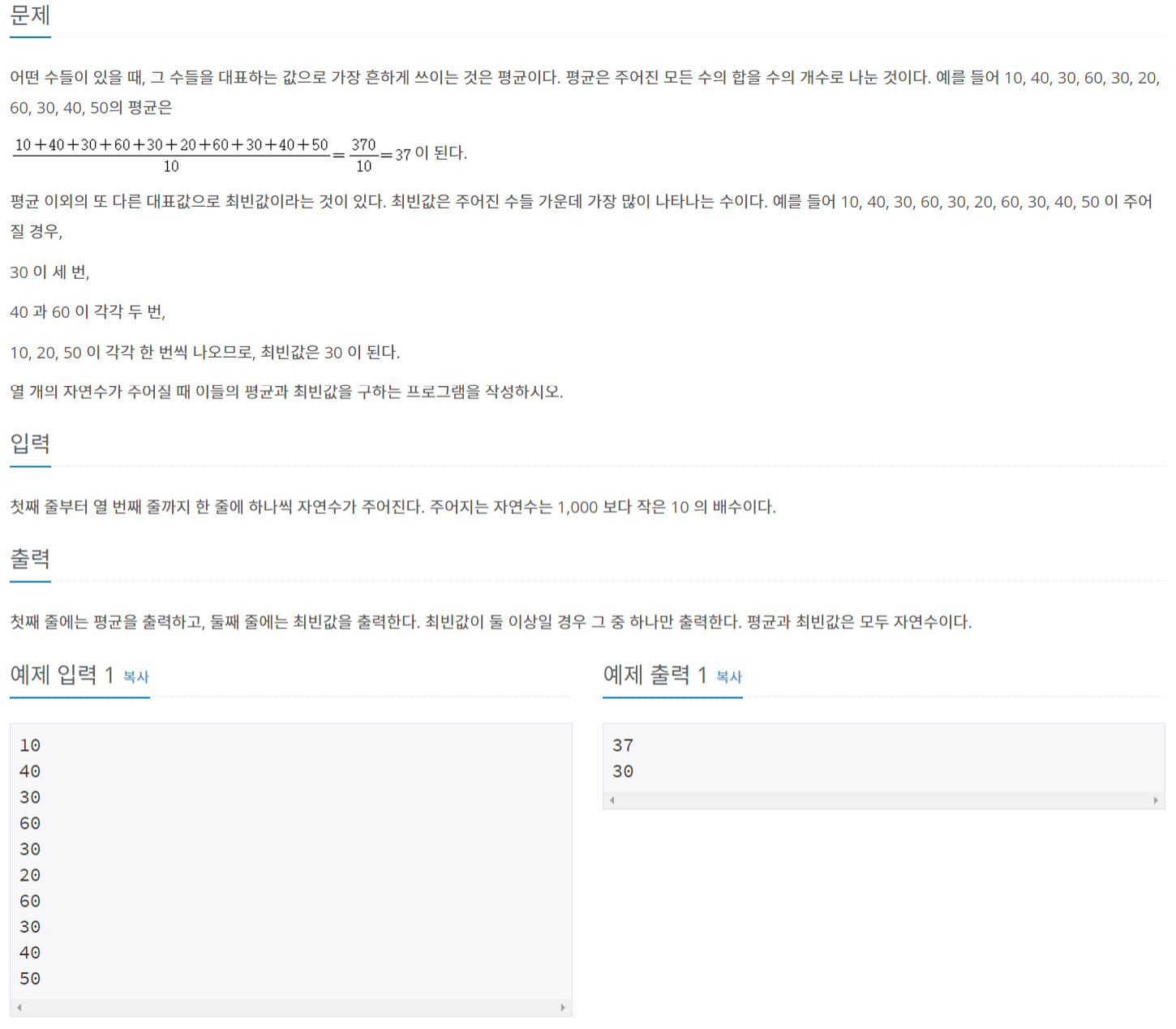 어떤 수들이 있을 때, 그 수들을 대표하는 값으로 가장 흔하게 쓰이는 것은 평균이다. 평균은 주어진 모든 수의 합을 수의 개수로 나눈 것이다. 예를 들어 10, 40, 30, 60, 30, 20, 60, 30, 40, 50의 평균은