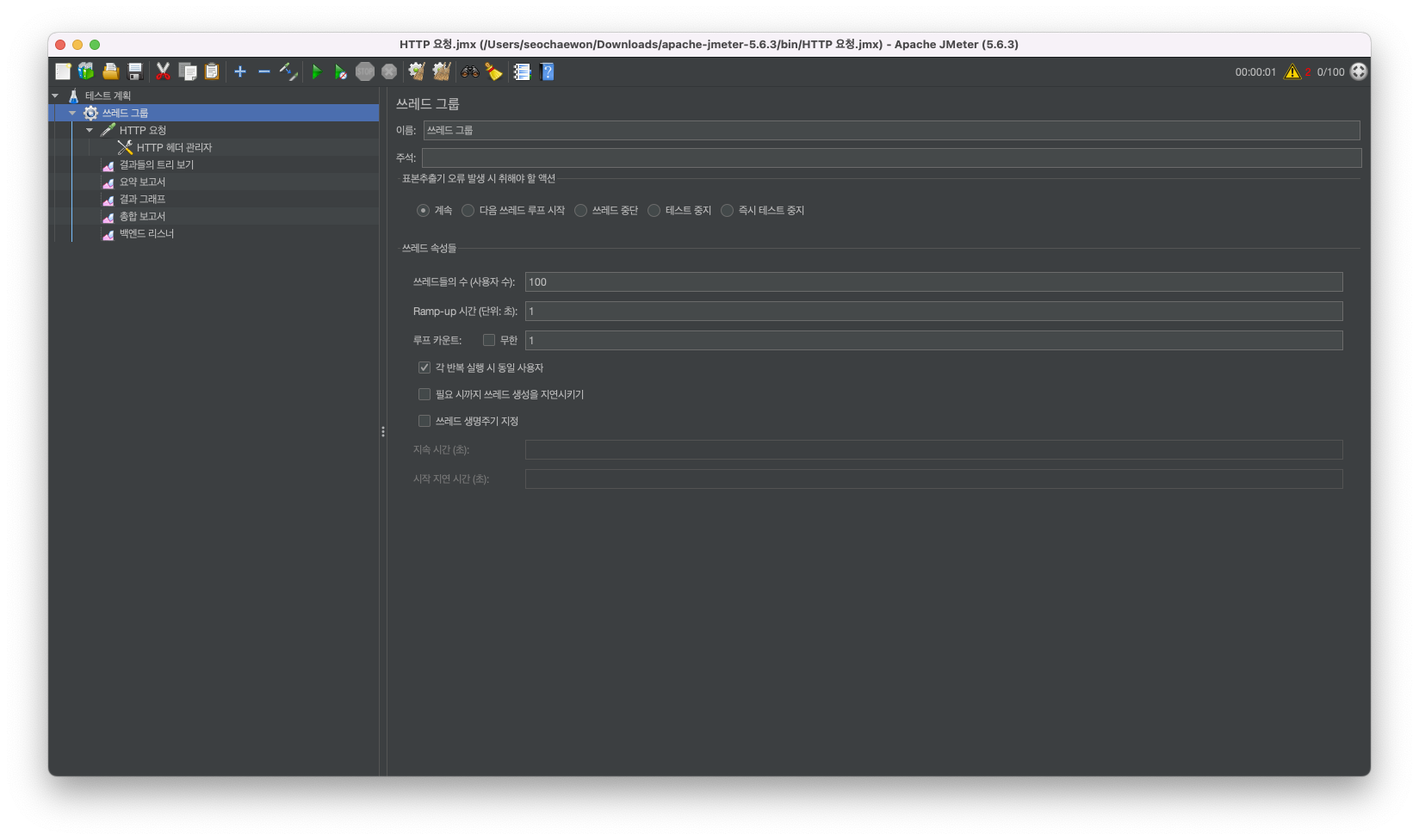 스레드 그룹을 생성해 사용자 수를 100으로 설정하고