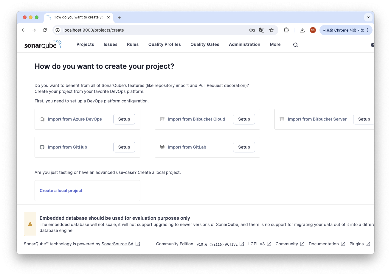 SonarQube에서 community 버전을 다운로드한 후 터미널을 통해 sonar 스크립트를 실행한다.