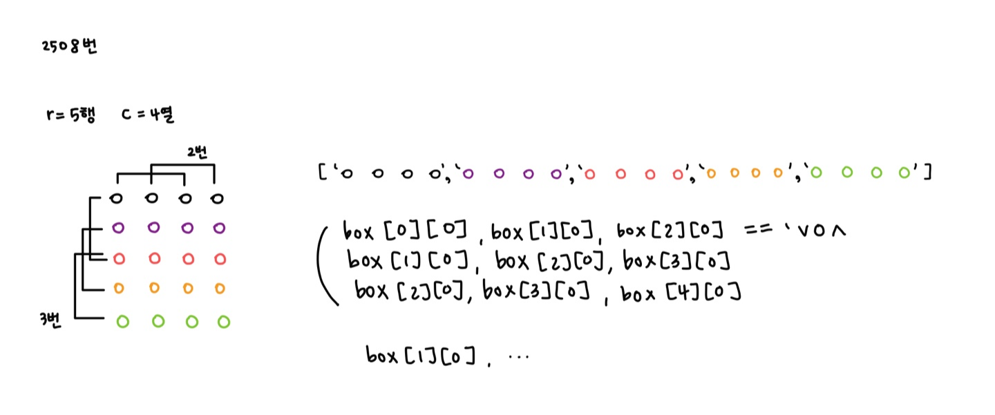 익숙한 형태인 가로로 비교하는 것이 아닌 세로로 비교해야 하는 문제이다. 이번에는 행을 세 개씩 묶어 검사해야 되기 때문에 '행 수 - 2' 한 만큼 열씩 검사를 해준다. 위의 필기처럼 box[0][0] + box[1][0] + box[2][0] 한 값이 'vo^' 이면 사탕이기 때문에 규칙성을 찾아 i와 j로 치환시켜준다.