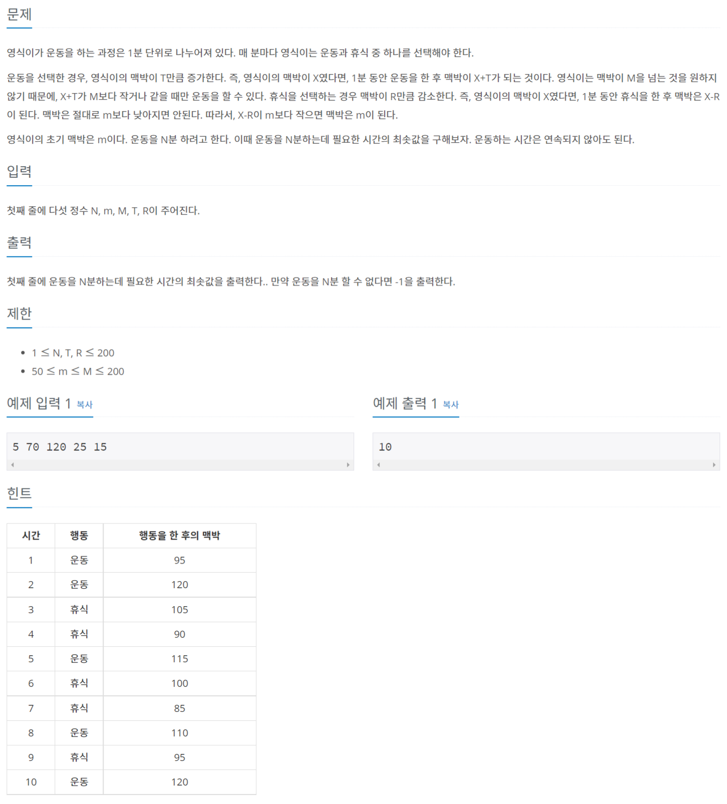 현재 맥박인 pulse + 운동 시 증가하는 맥박 <= 최대 맥박 일 경우 운동을 할 수 있다.