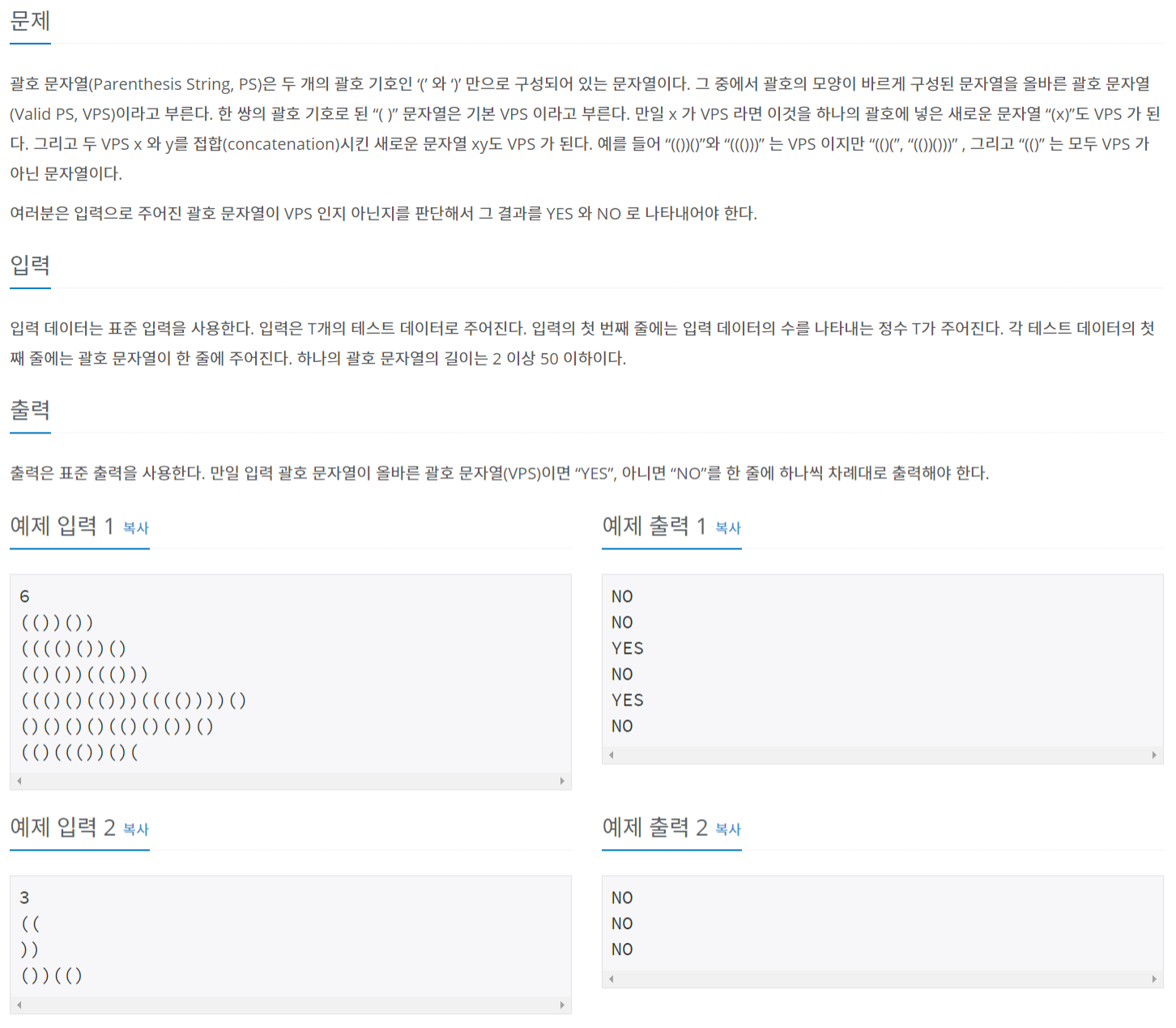 괄호 문자열(Parenthesis String, PS)은 두 개의 괄호 기호인 ‘(’ 와 ‘)’ 만으로 구성되어 있는 문자열이다. 그 중에서 괄호의 모양이 바르게 구성된 문자열을 올바른 괄호 문자열(Valid PS, VPS)이라고
