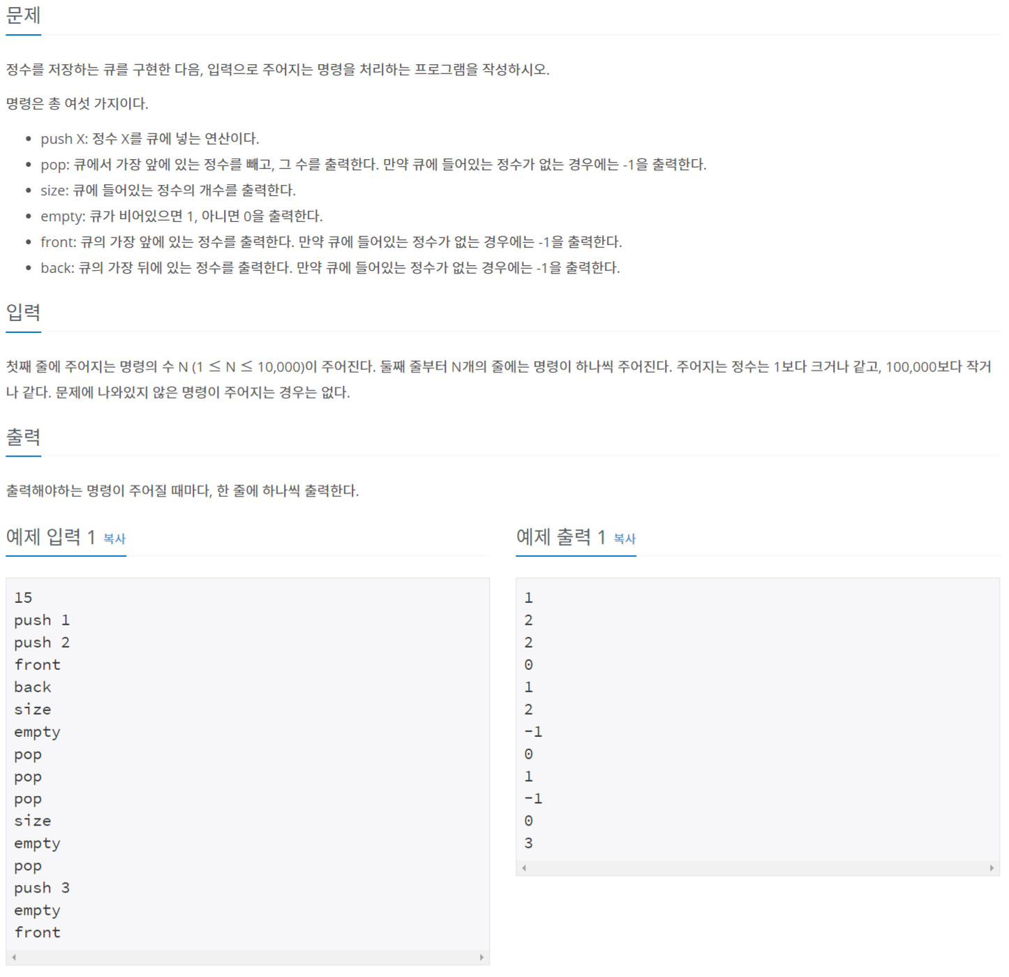 클래스로 큐를 선언하고 문제에 나와있는 함수를 구현했다.