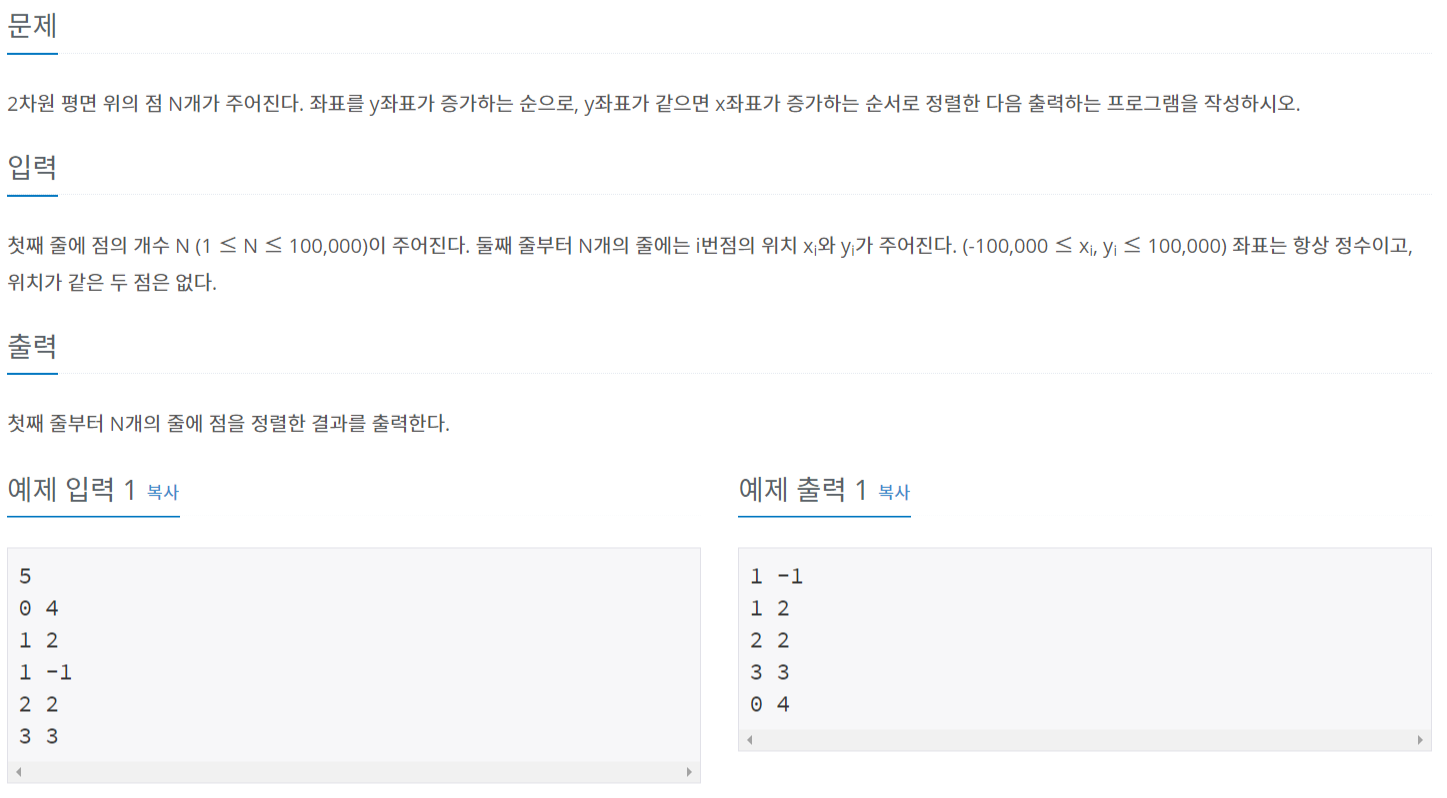 [문제] https://www.acmicpc.net/problem/11650 11650번: 좌표 정렬하기 첫째 줄에 점의 개수 N (1 ≤ N ≤ 100,000)이 주어진다. 둘째 줄부터 N개의 줄에는 i번점의 위치 xi와 yi가 주어진다. (-100,000 ≤ xi, y..