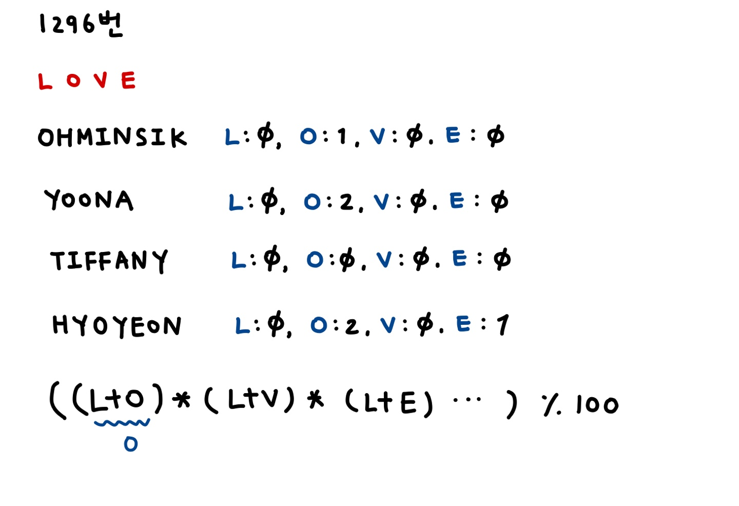 되게 쉬운 문제라고 생각하고 풀었는데 이름 중에 알파벳 'L'이 들어가지 않은 사람일 경우 어떤 수에 0을 곱해도 0이 돼 예제 입력 소녀시대 멤버들의 이름에는 'L'이 들어가는 사람이 없어 모든 확률이 0이 되는 게 이해가 안 돼서 뭔가 헤맸다..