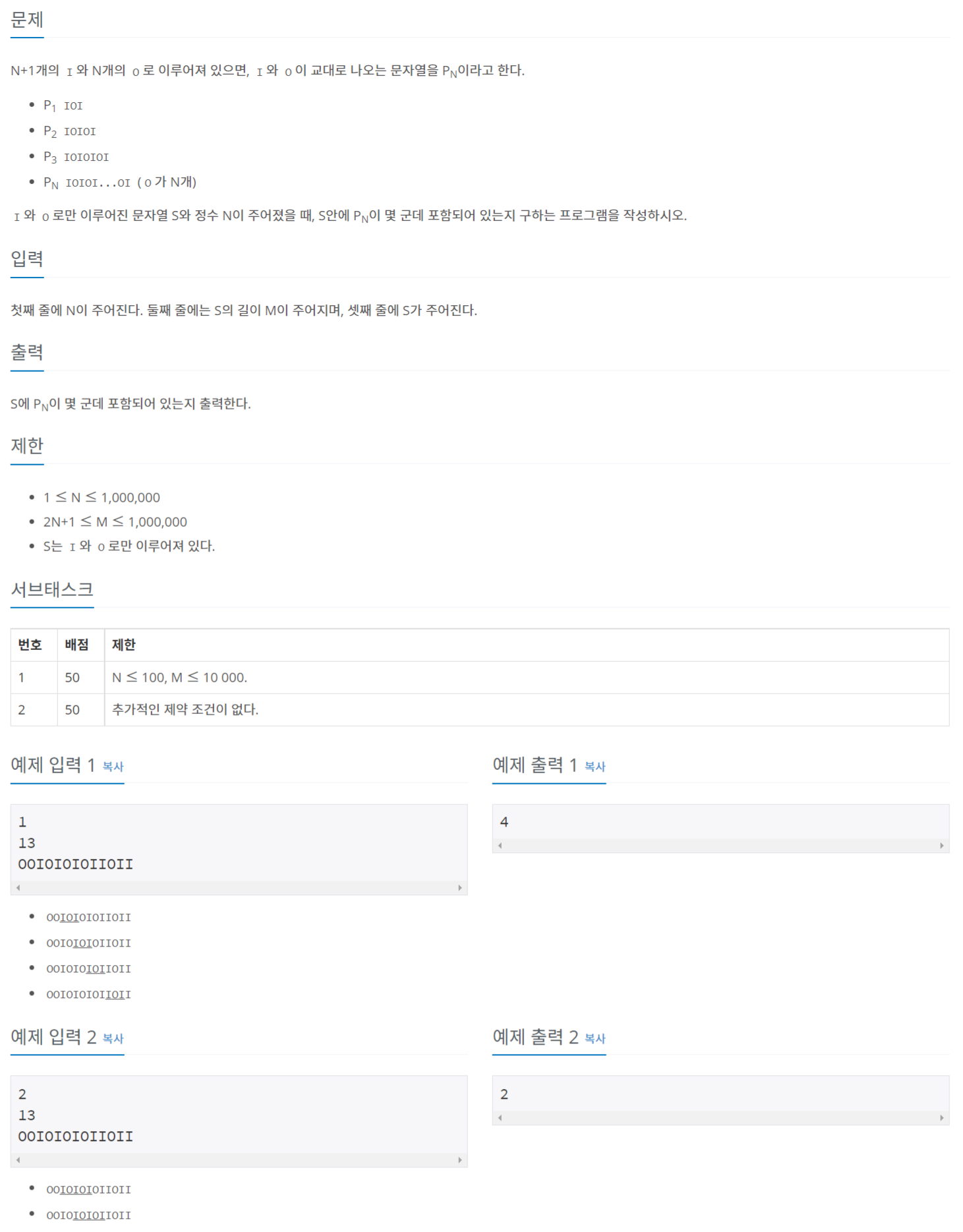 N+1개의 I와 N개의 O로 이루어져 있으면, I와 O이 교대로 나오는 문자열을 PN이라고 한다. P1 IOI P2 IOIOI P3 IOIOIOI PN IOIOI...OI (O가 N개) I와 O로만 이루어진 문자열 S와 정수 N이 주어졌을 때, S안에 PN이 몇